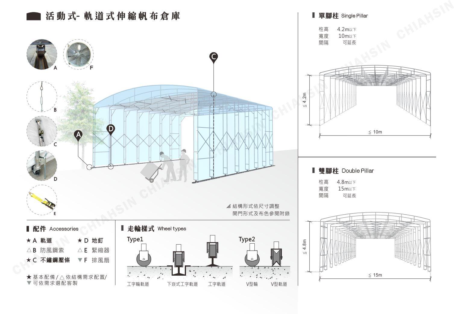 ▪軌道伸縮帆布倉庫主架結構採頂圓型,可採雙柱式結構,雙叉管及彎頂力學設計,堅 固實用、耐久,軌道式伸縮走輪