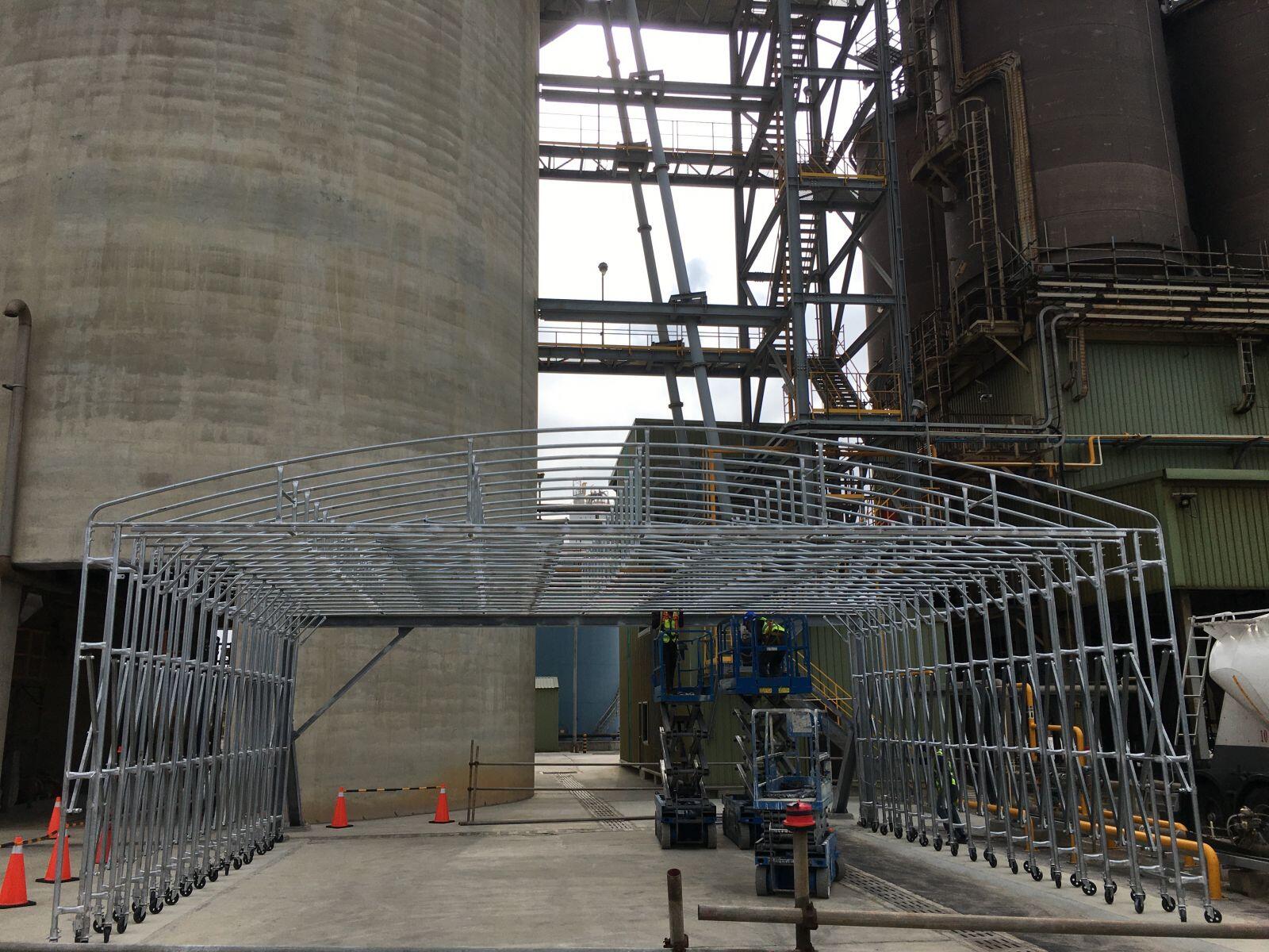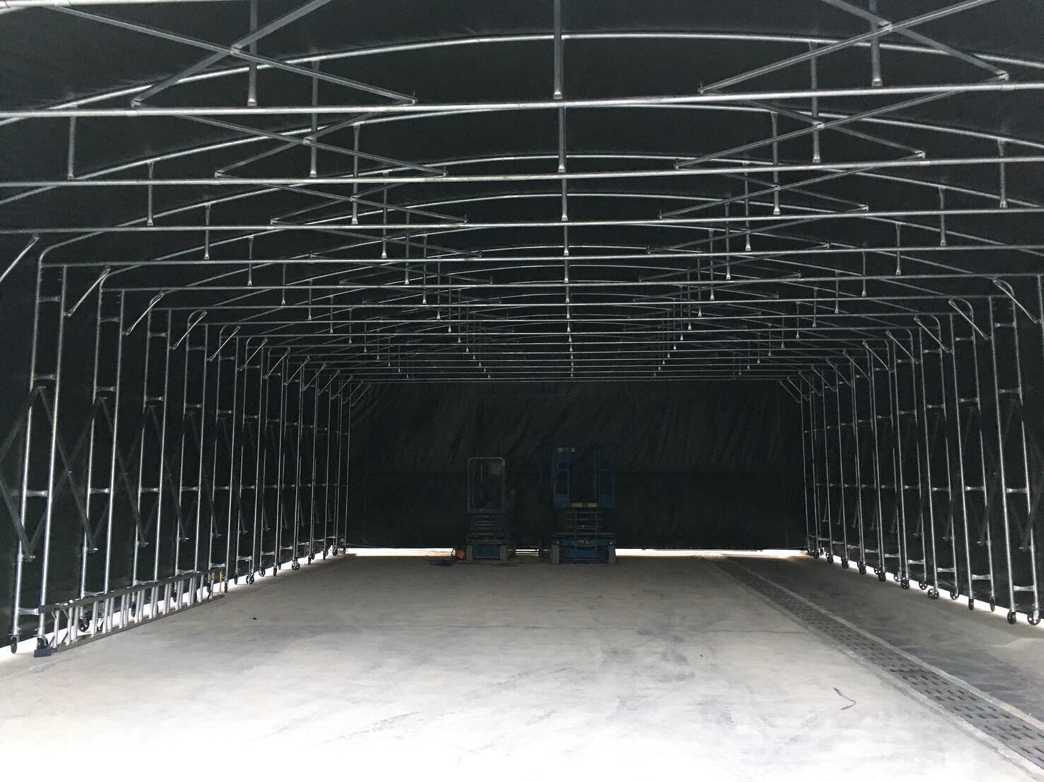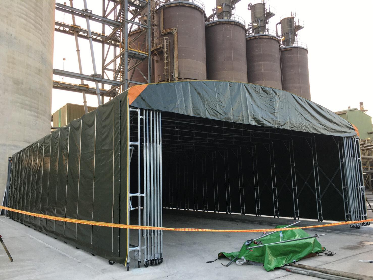 訂製大型活動伸縮棚架做完物料暫存區並加設防颱H鋼構框架