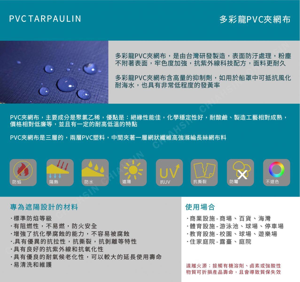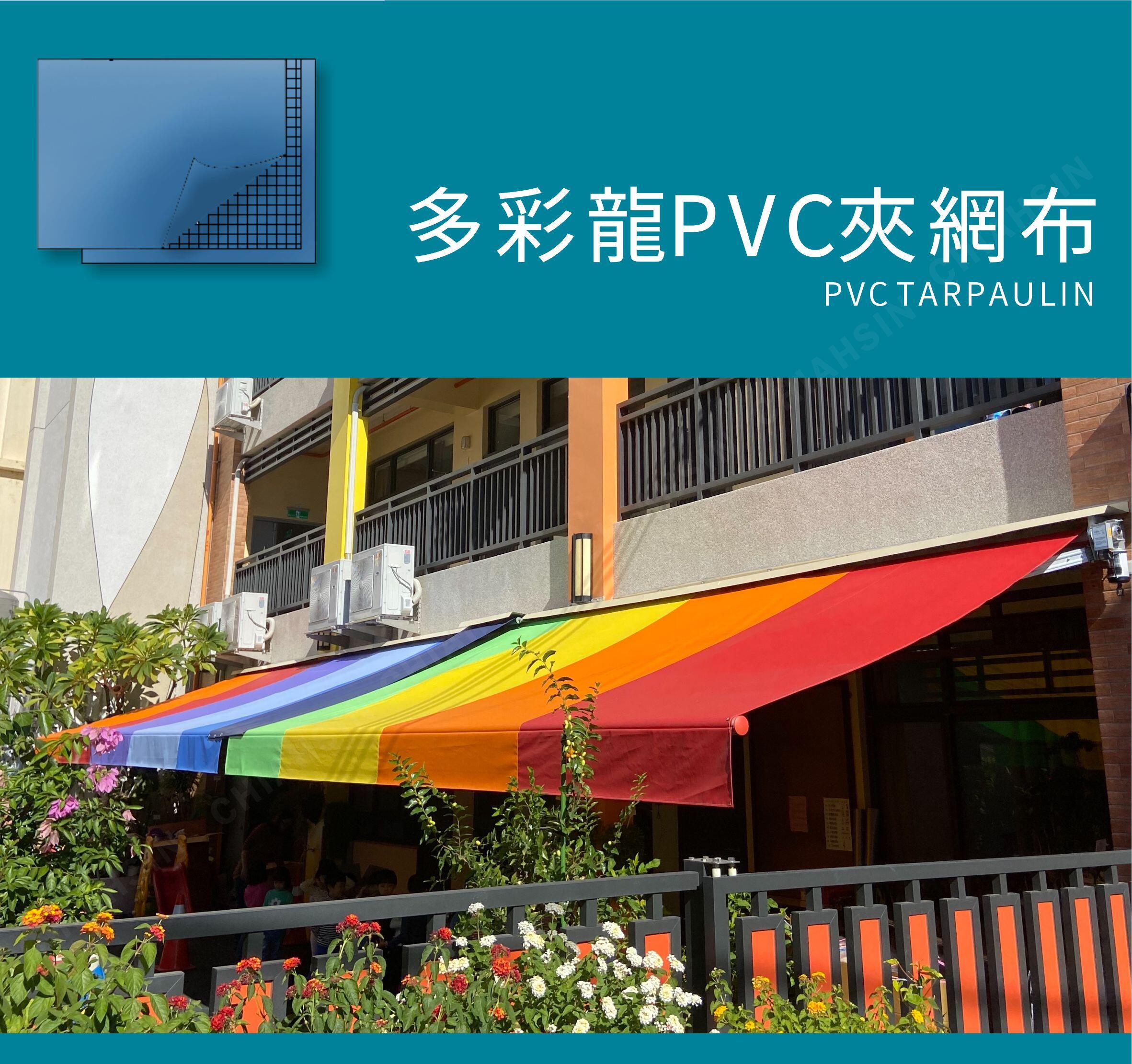 多彩龍PVC夾網布,是由台灣研發製造,表面防汙處理,粉塵不附著表面,牢色度加強,抗紫外線科技配方,面料更耐久