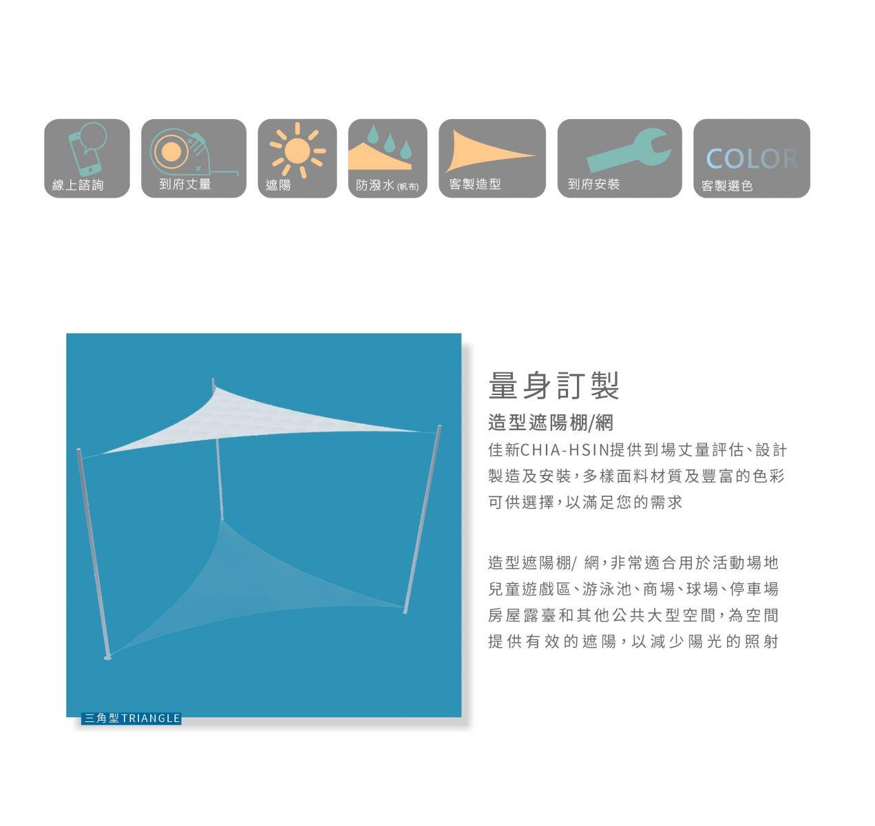 佳新帆布 提供到場丈量評估、設計、製造及安裝,多樣面料材質及色彩可供選擇,以滿足您的需求
